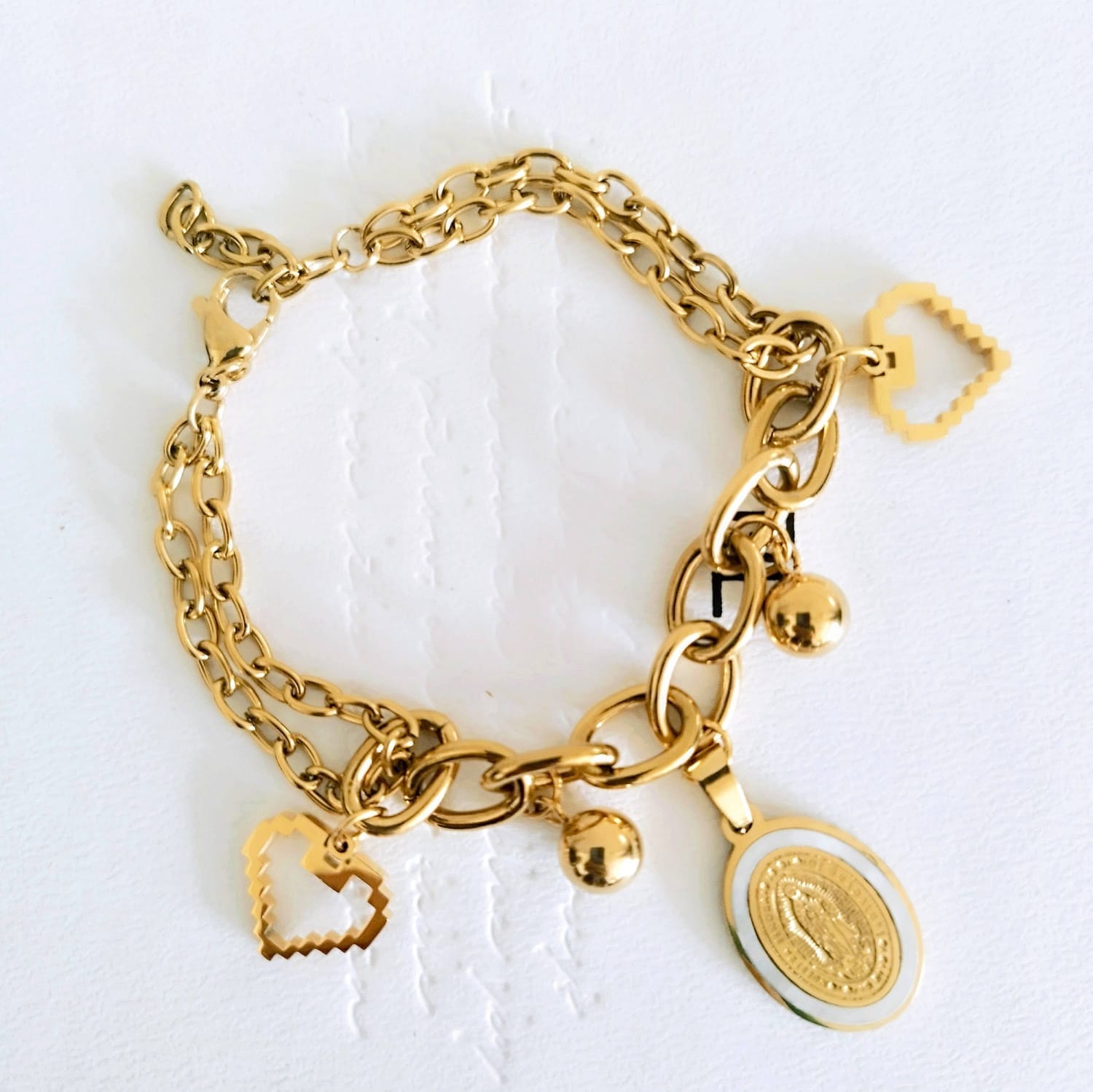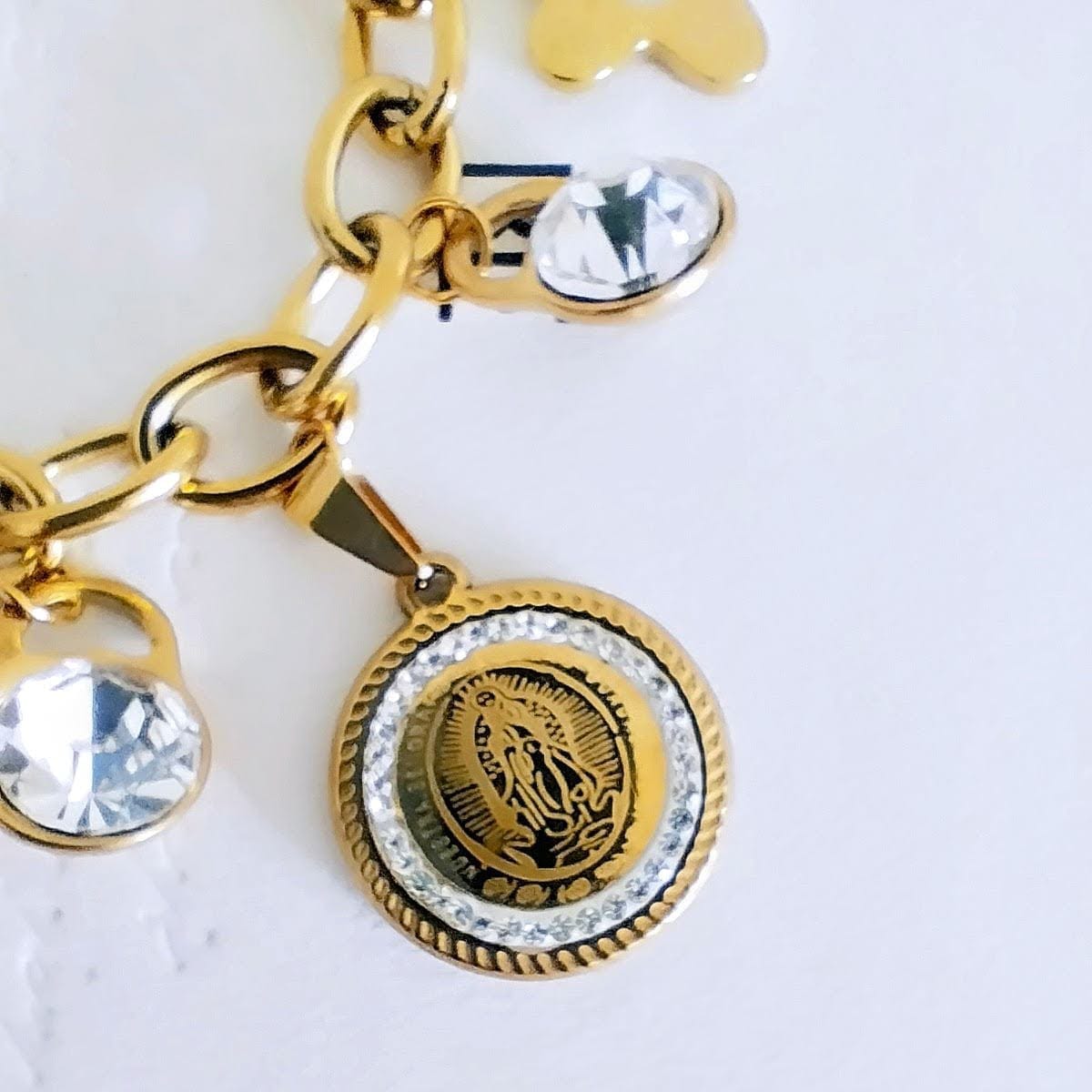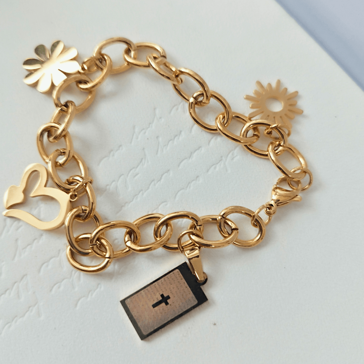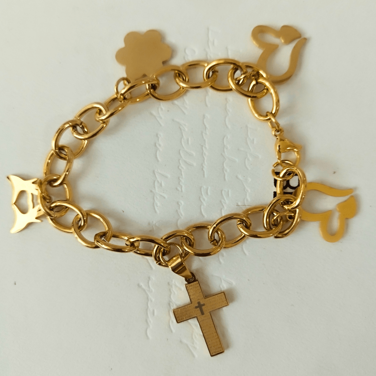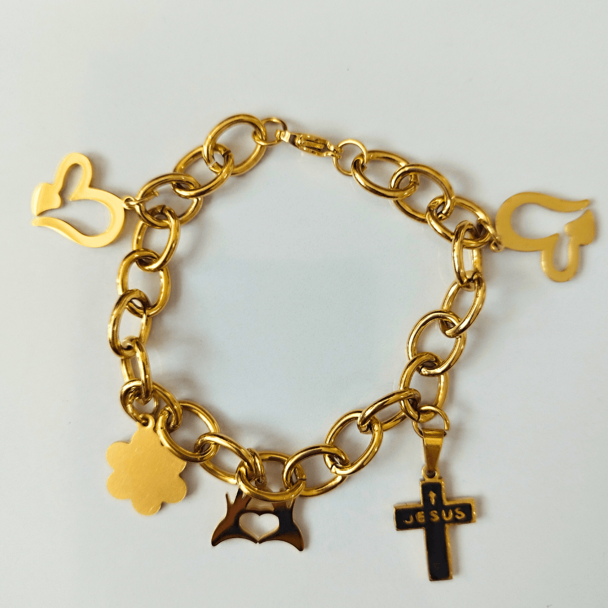 The Gold-Plated Stainless Steel Charm Bracelet combines spirituality and style, featuring a