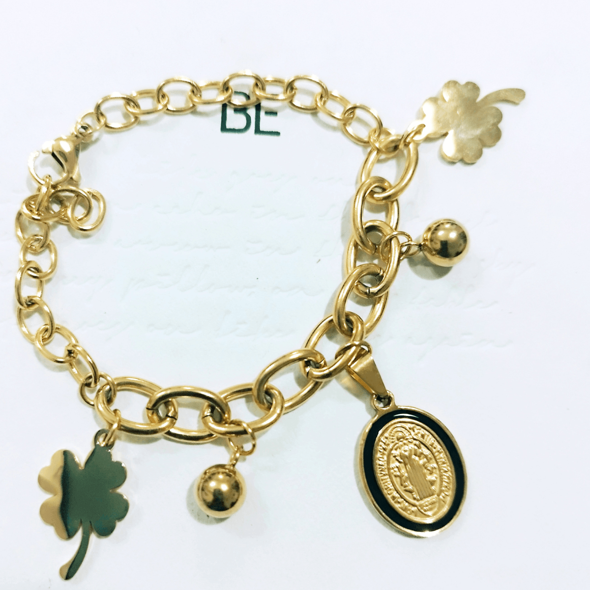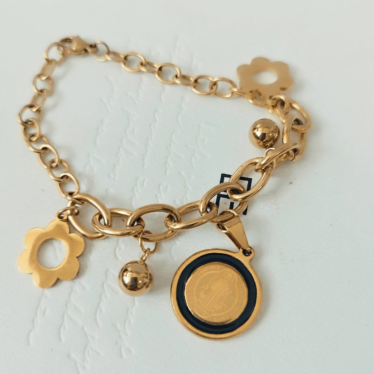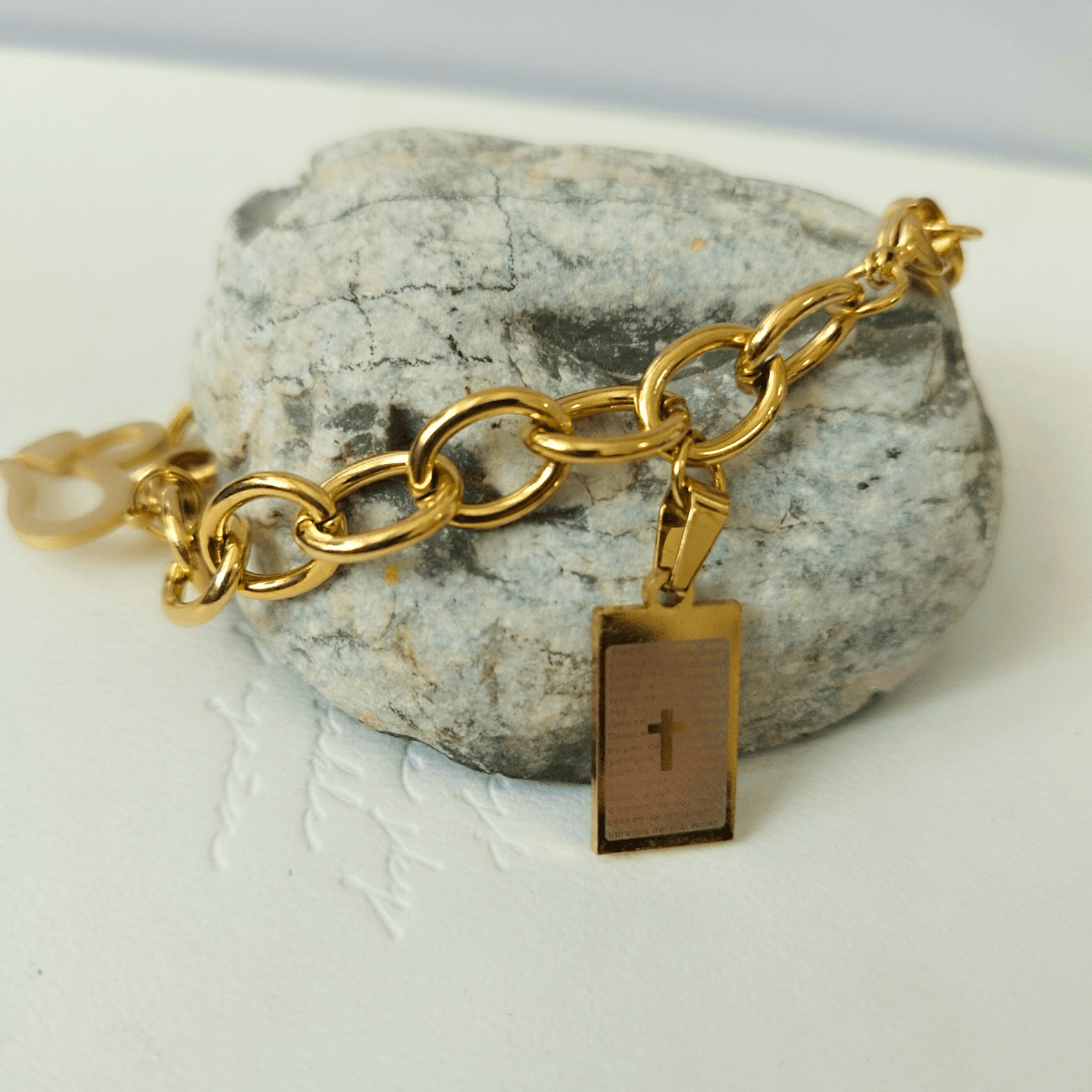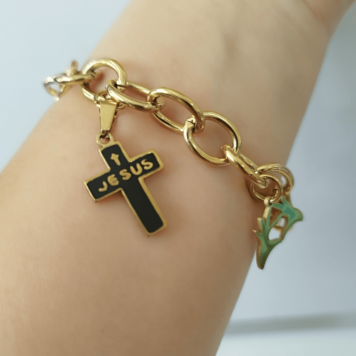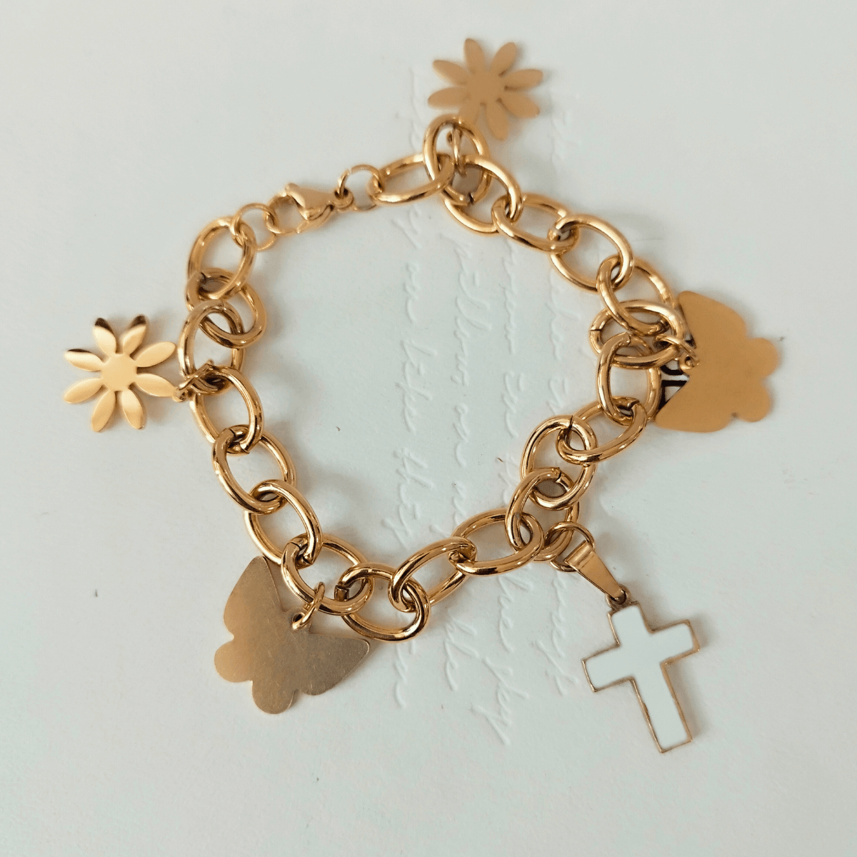 The Gold-Plated Stainless Steel Charm Bracelet combines spirituality and style, featuring a