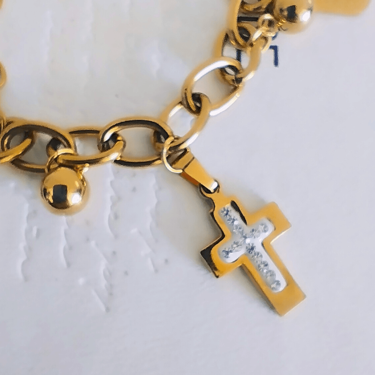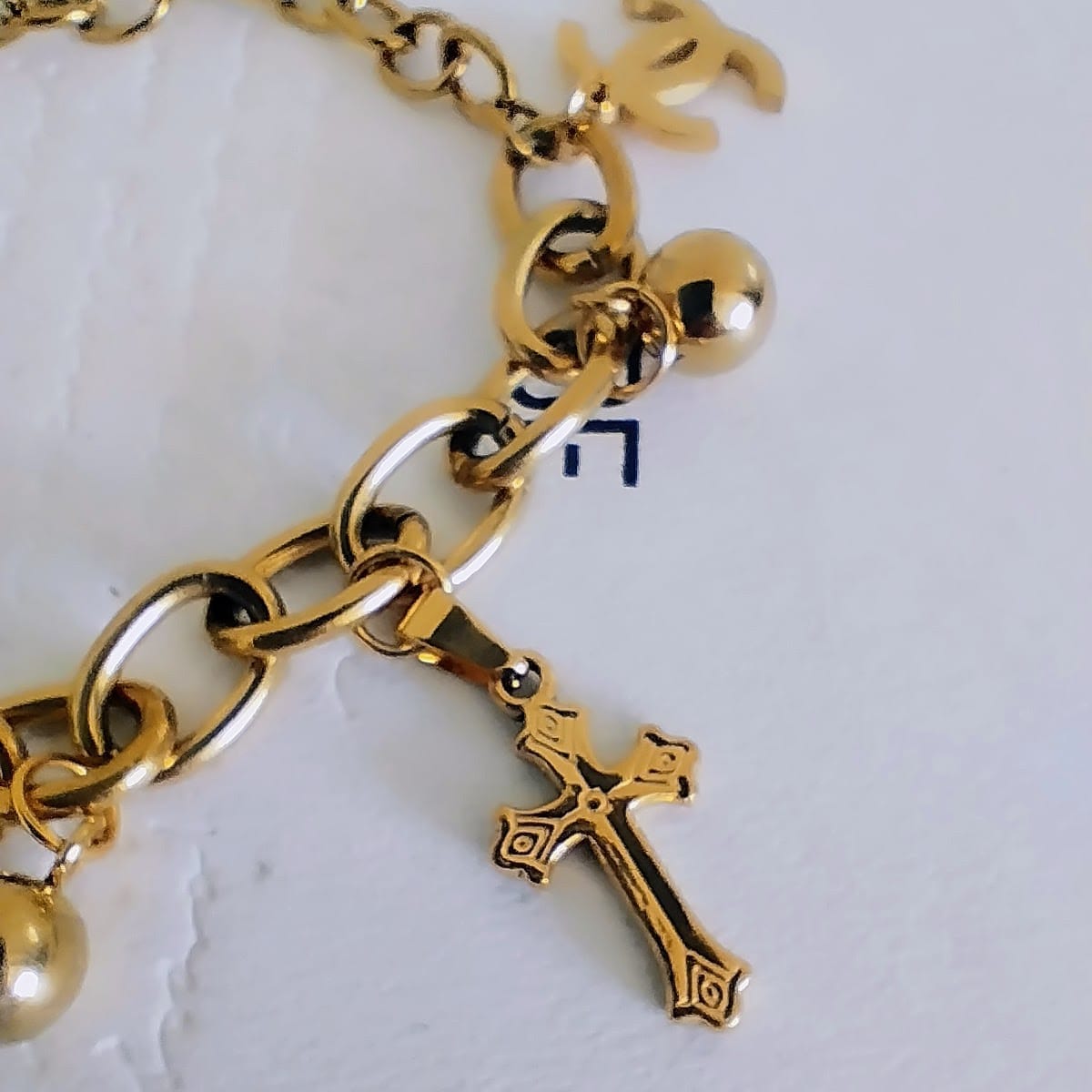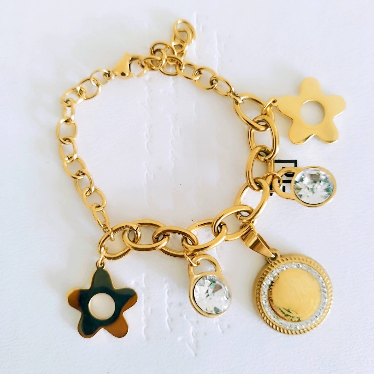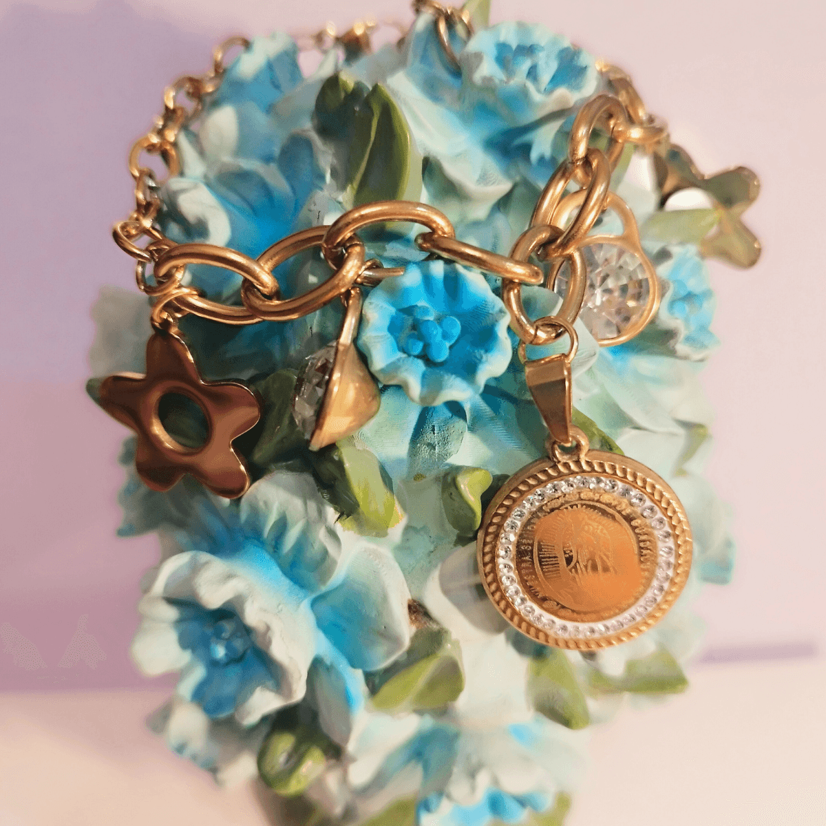 The Gold-Plated Stainless Steel Charm Bracelet combines spirituality and style, featuring a
