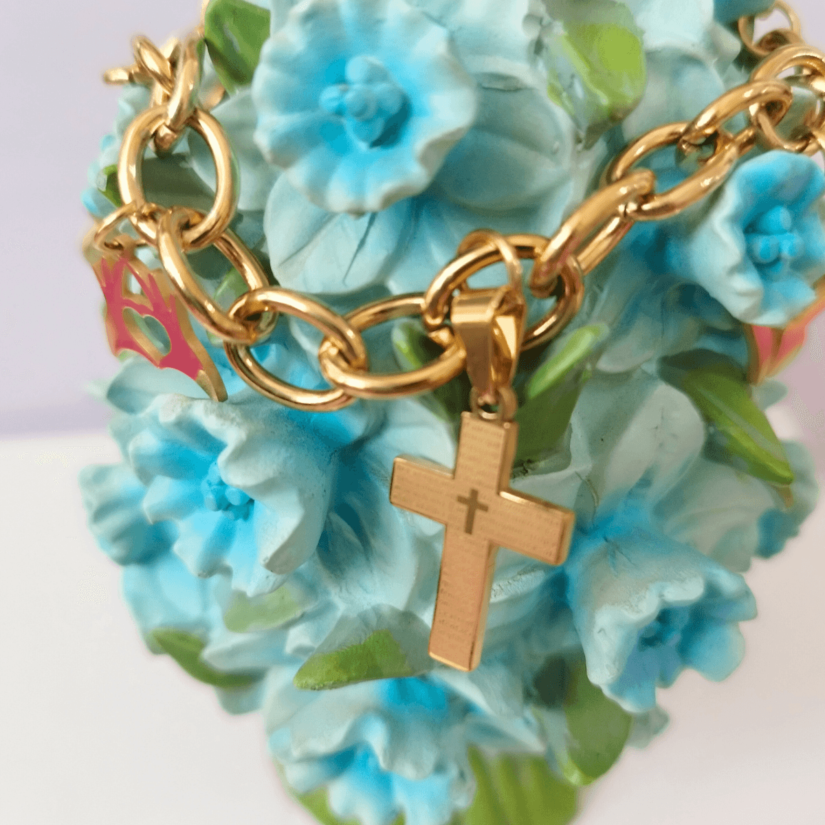 white cross, butterflies, and flower charms that symbolize faith and positivity.